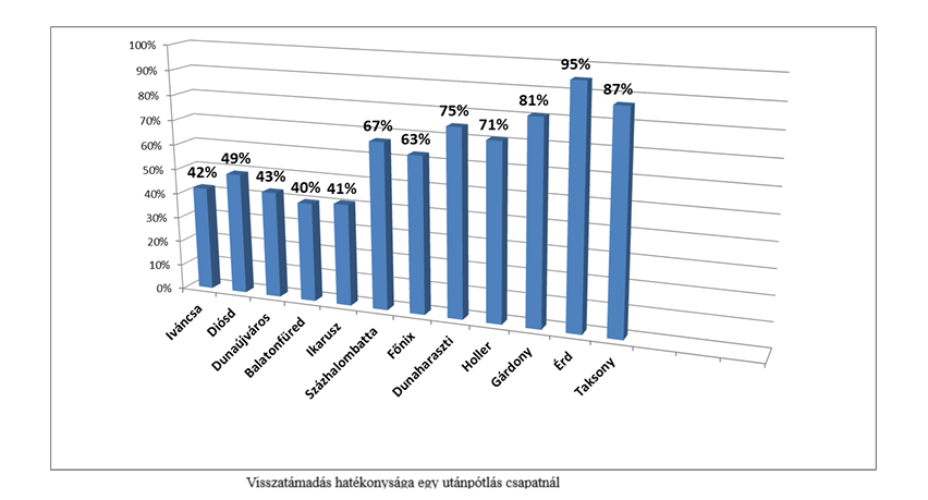 Volt edzőkollégám, Palotai Nándor (Isten nyugosztalja!) akivel hasonló képzés mentén -egykori szakmai vezetőnkkel is szembe menve- hittünk a saját tapasztalatainkban és futsal-jellegű képzést végeztünk a NB2-es utánpótlás, nagy pályás csapatunknál. Írtam mérkőzésről mérkőzésre a visszatámadások hatékonyságát, melyből az egyik idény statisztikáját bemásolom diagrammon: